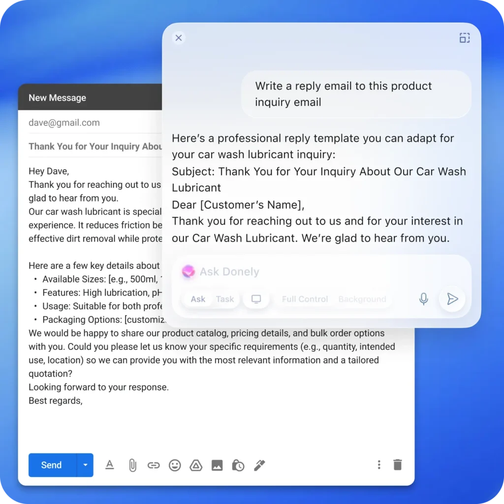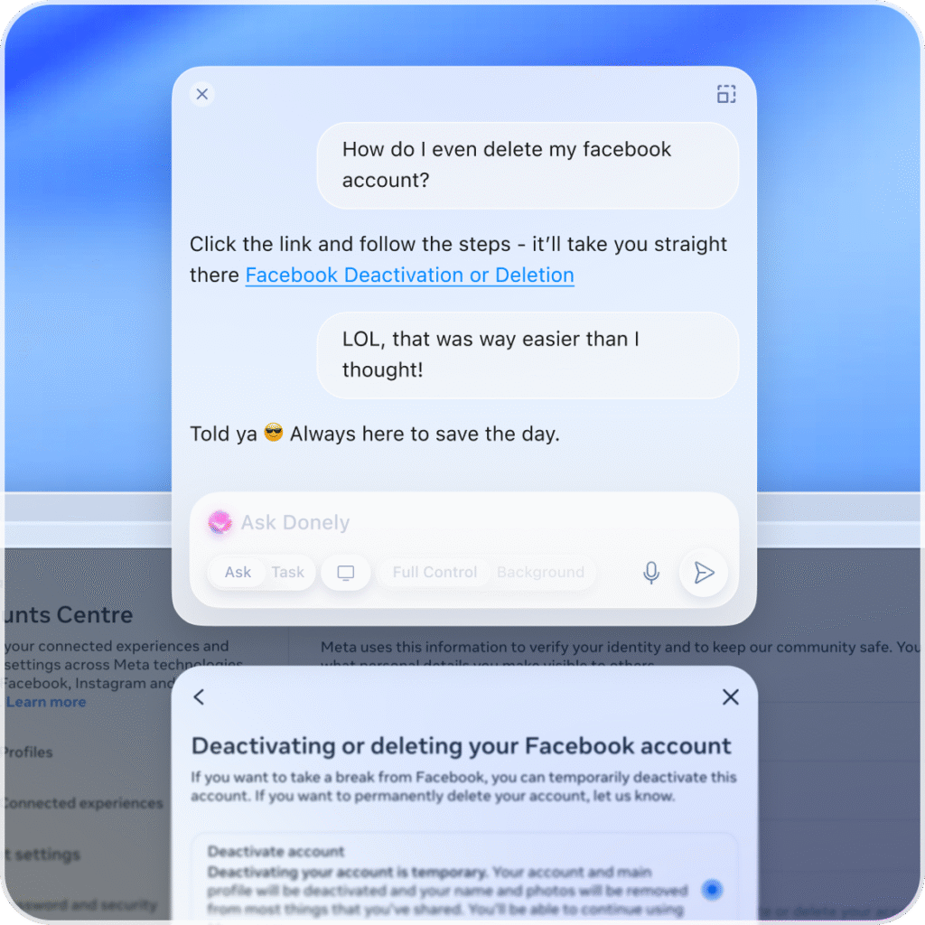 The same intelligence, but with hands. Donely won’t just tell you, it’ll actually click, type, and handle tasks for you.