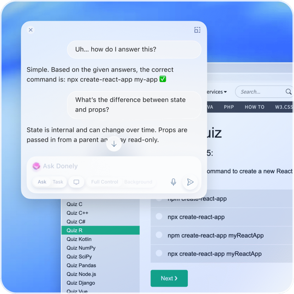 Ace tricky questions. Get clear answers when you’re stuck. Later, Donely will complete the task directly on your screen.